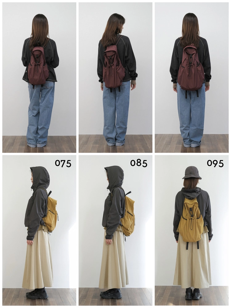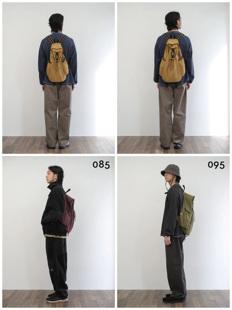 085 - 約20L / 幅 27 / 高さ 42 / 底マチ 18 / 重量 約280g(カラビナ除く)
